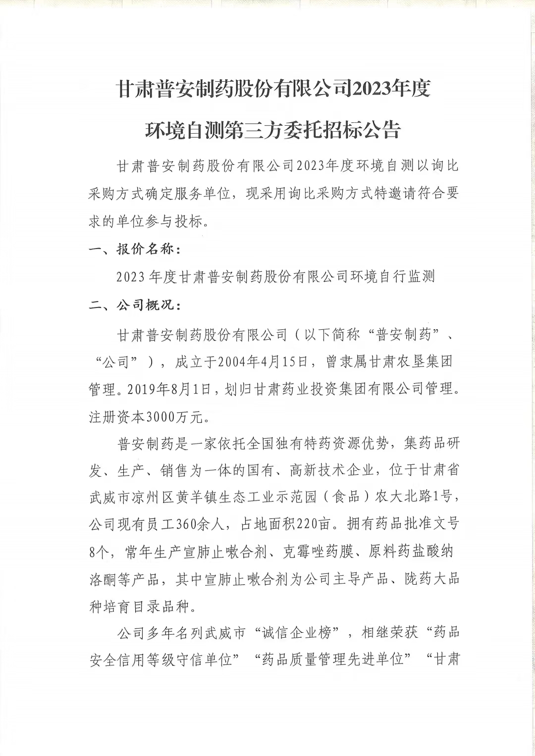 甘肅普安制藥股份有限公司2023年度環境自測第三方委托招標公告