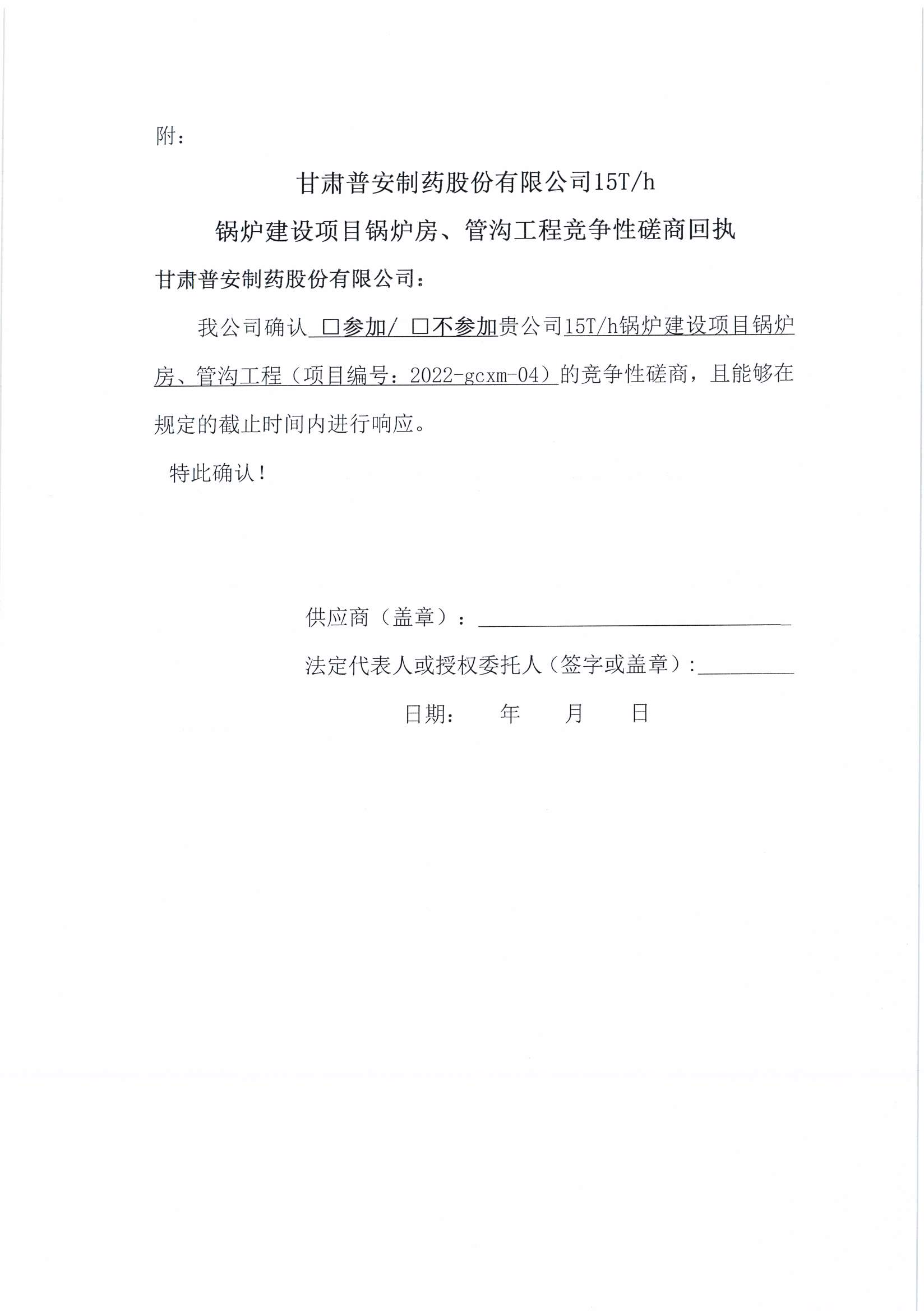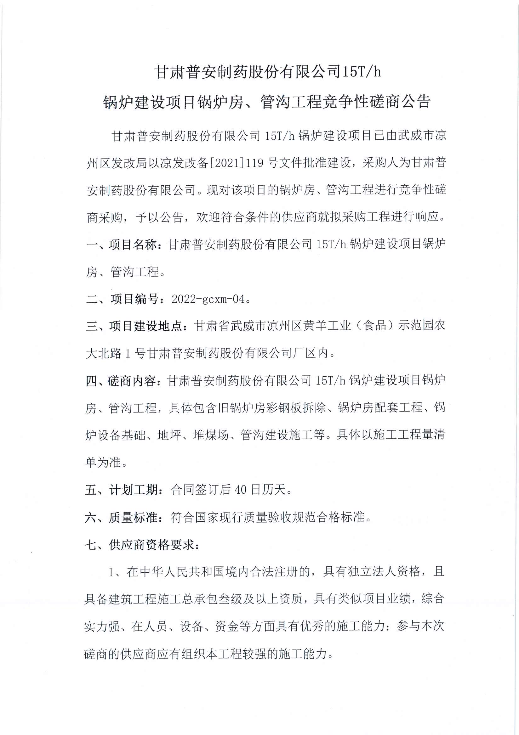 甘肅普安制藥股份有限公司關于對15T/h鍋爐建設項目鍋爐房、管溝工程競爭性談判公告的澄清