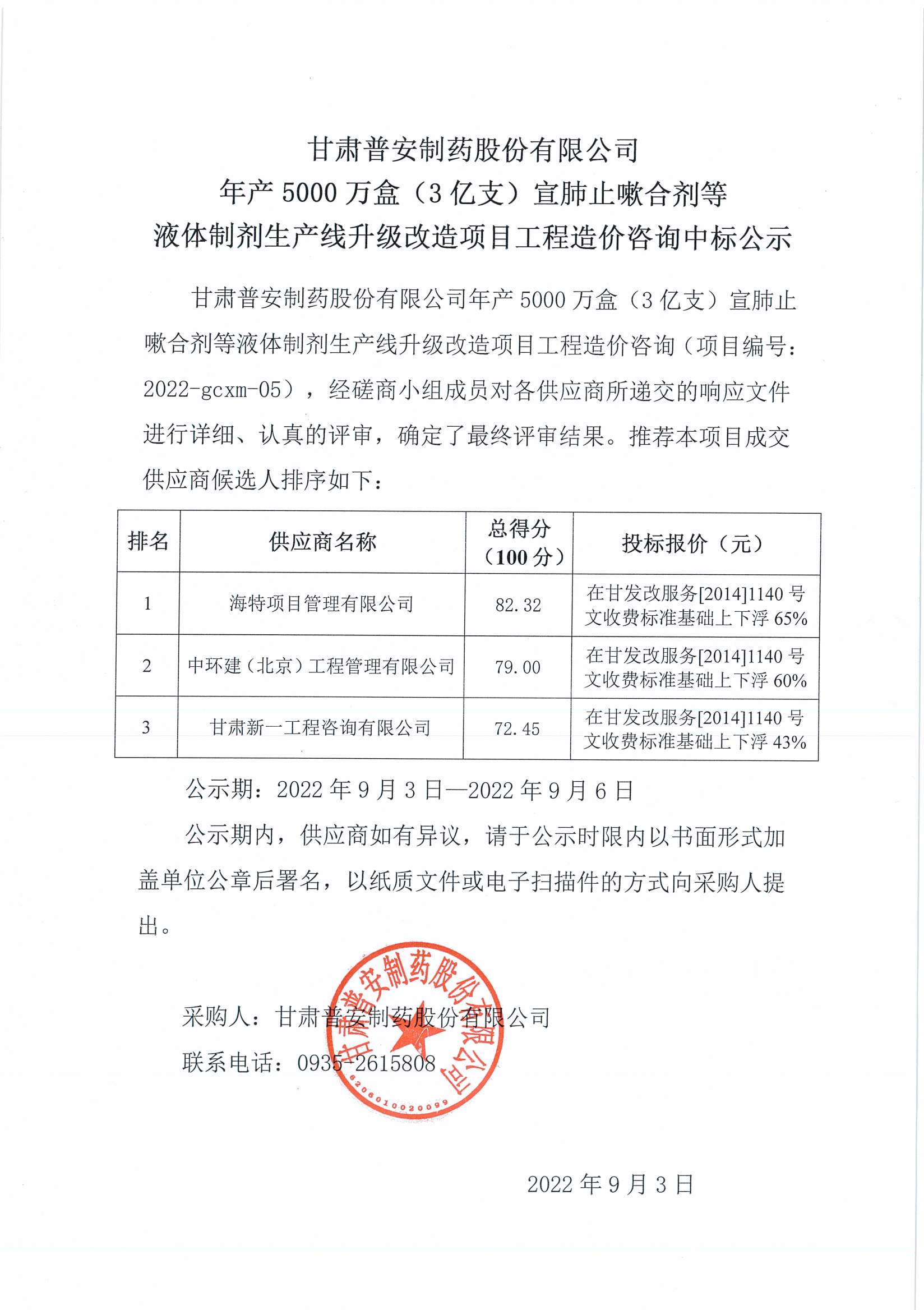 甘肅普安制藥股份有限公司年產5000萬盒(3億支)宣肺止嗽合劑等液體制劑生產線升級改造項目工程造價咨詢中標公示