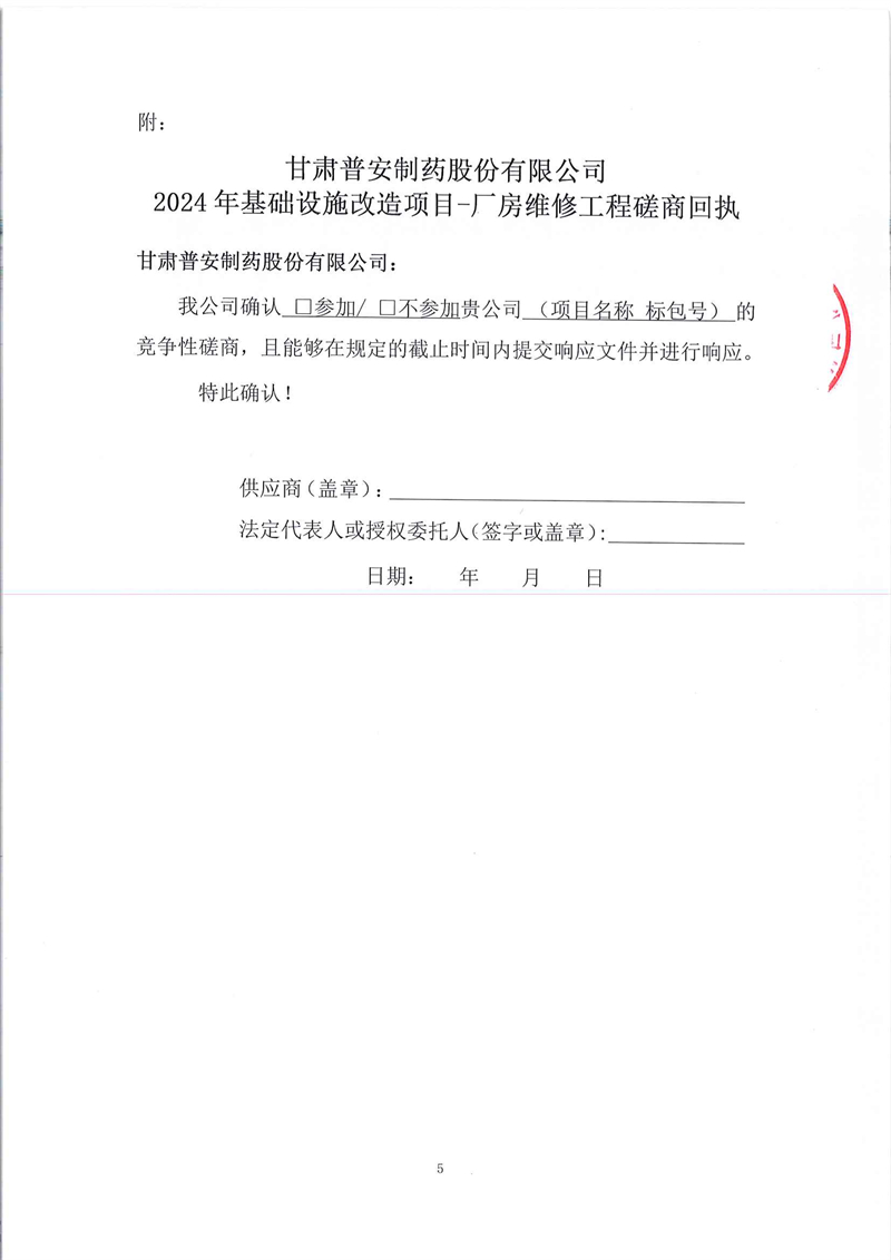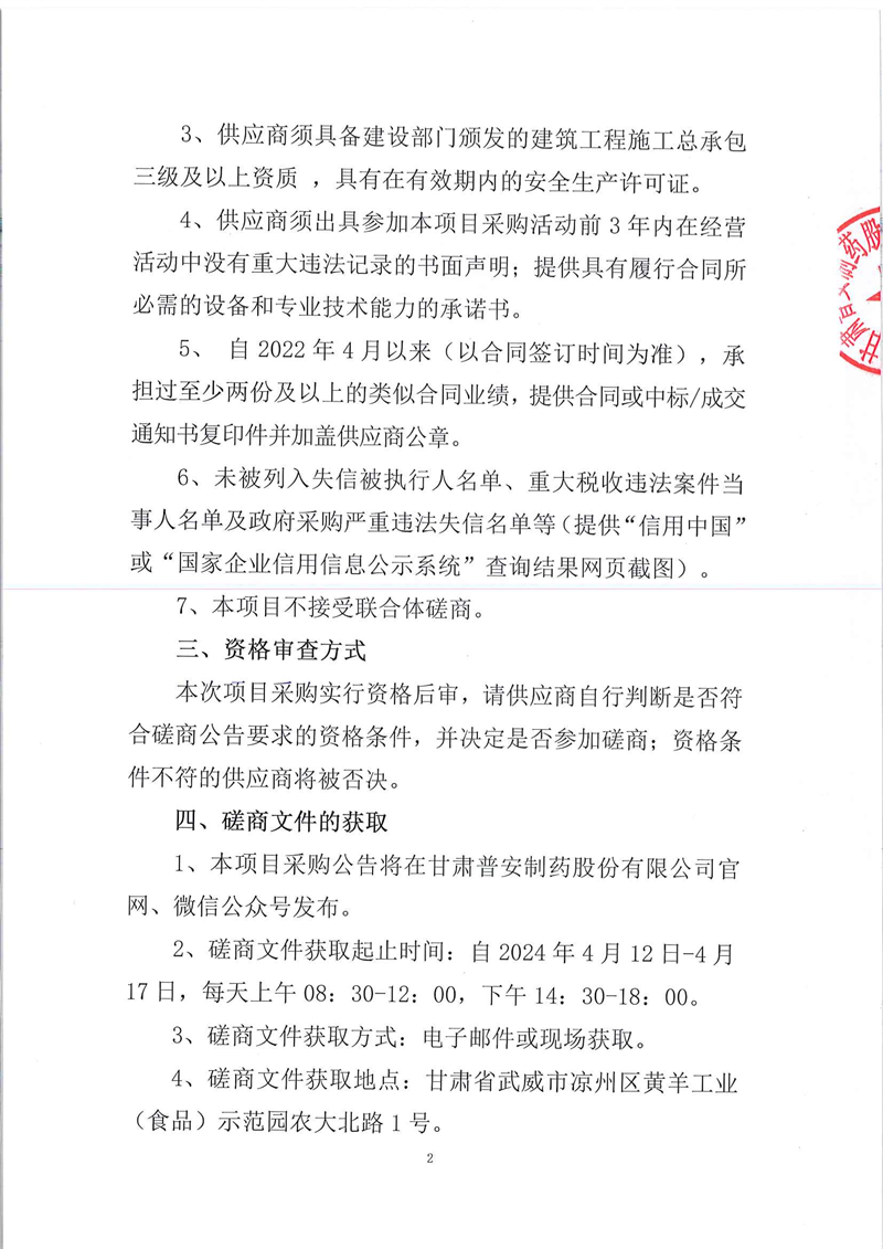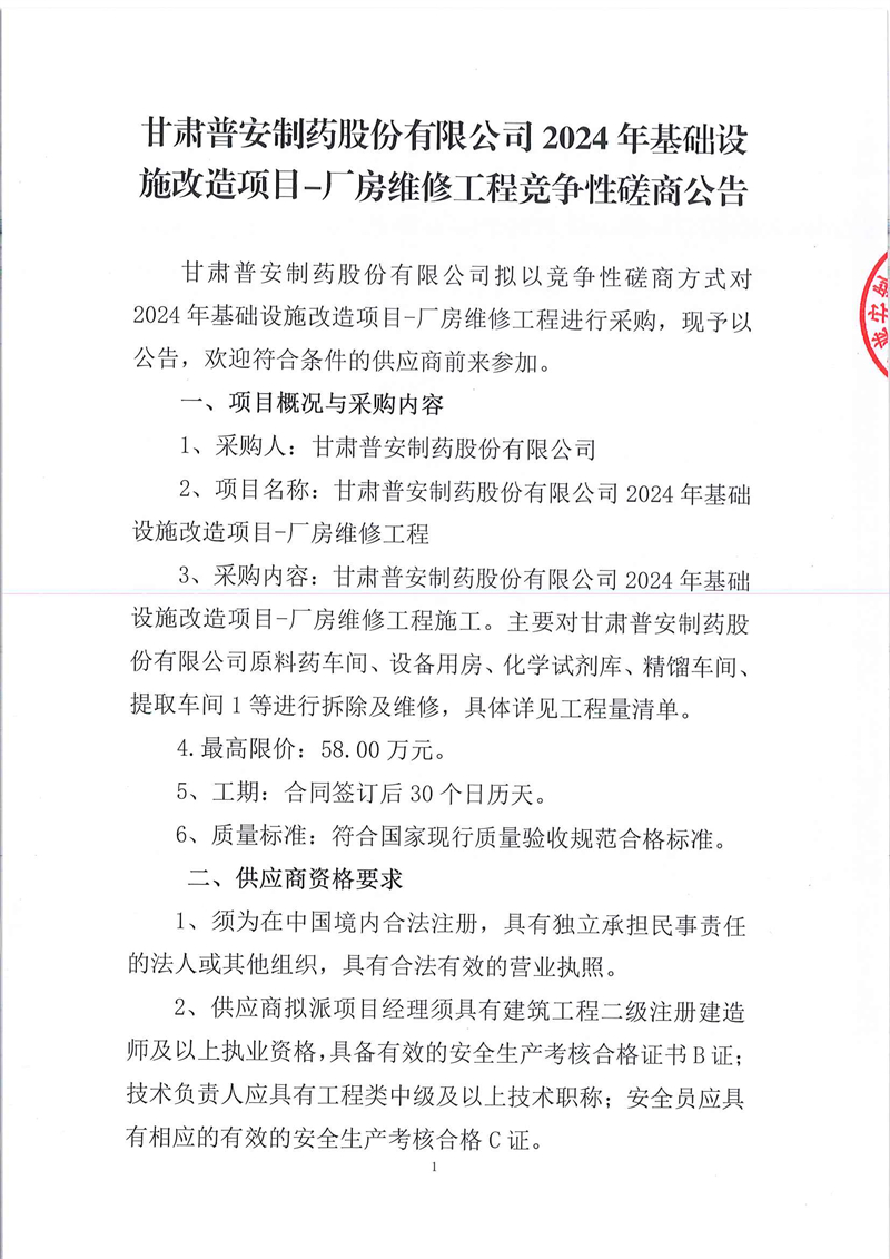 甘肅普安制藥股份有限公司2024年基礎(chǔ)設(shè)施改造項(xiàng)目-廠房維修工程競(jìng)爭(zhēng)性磋商公告