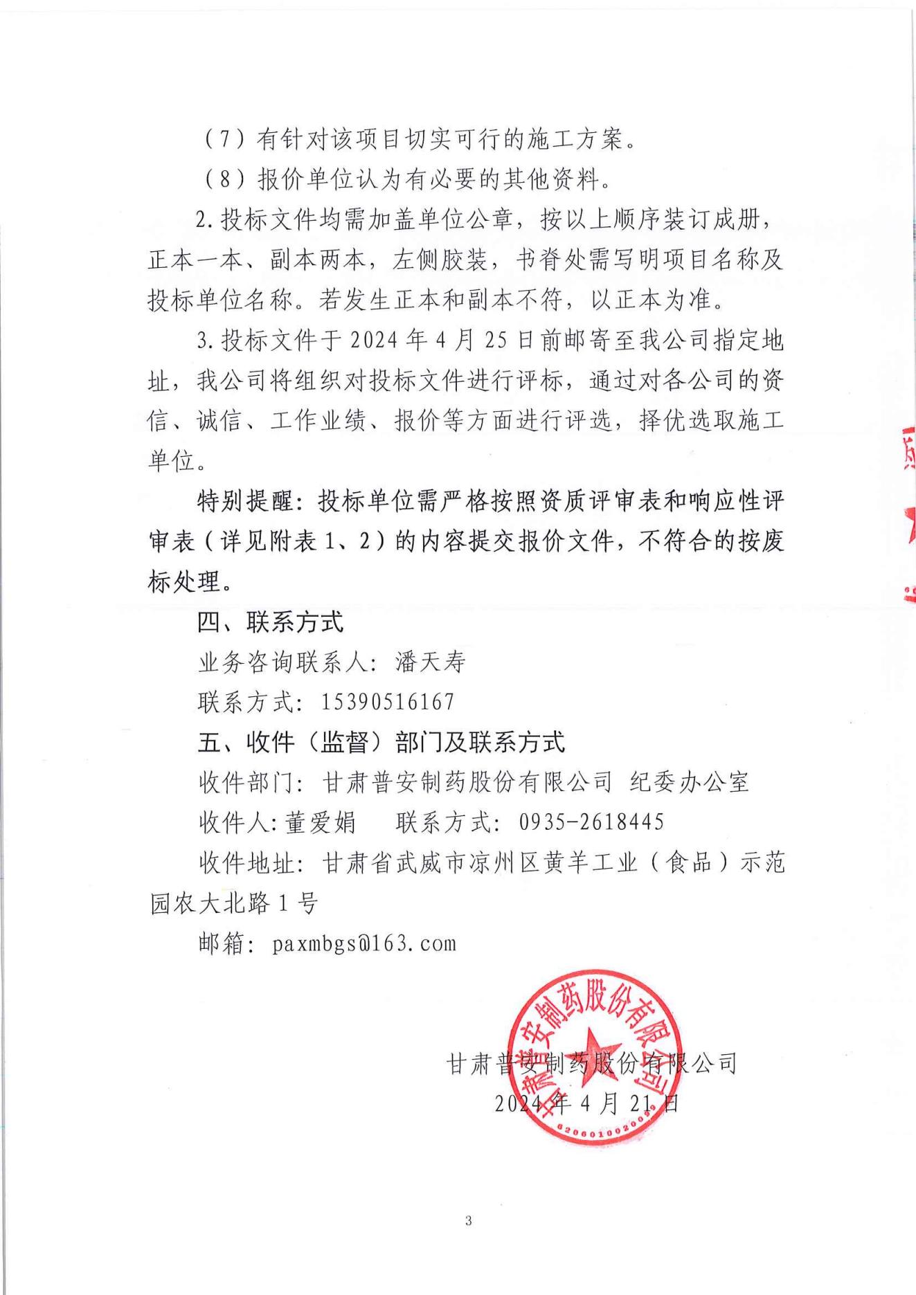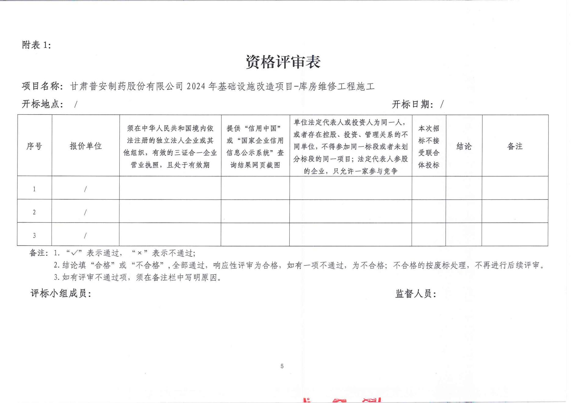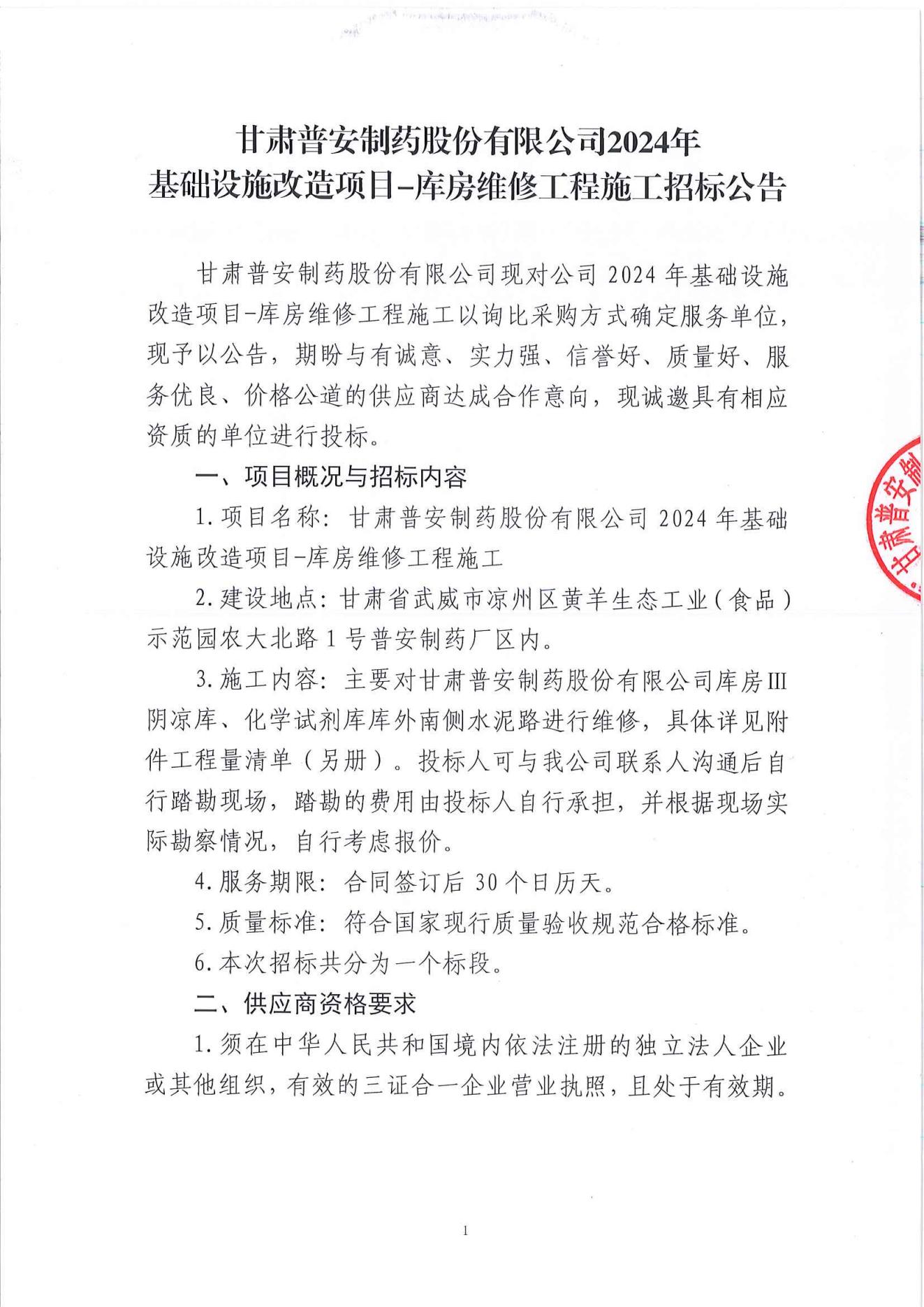 甘肅普安制藥股份有限公司2024年基礎(chǔ)設(shè)施改造項目-庫房維修工程施工招標(biāo)公告