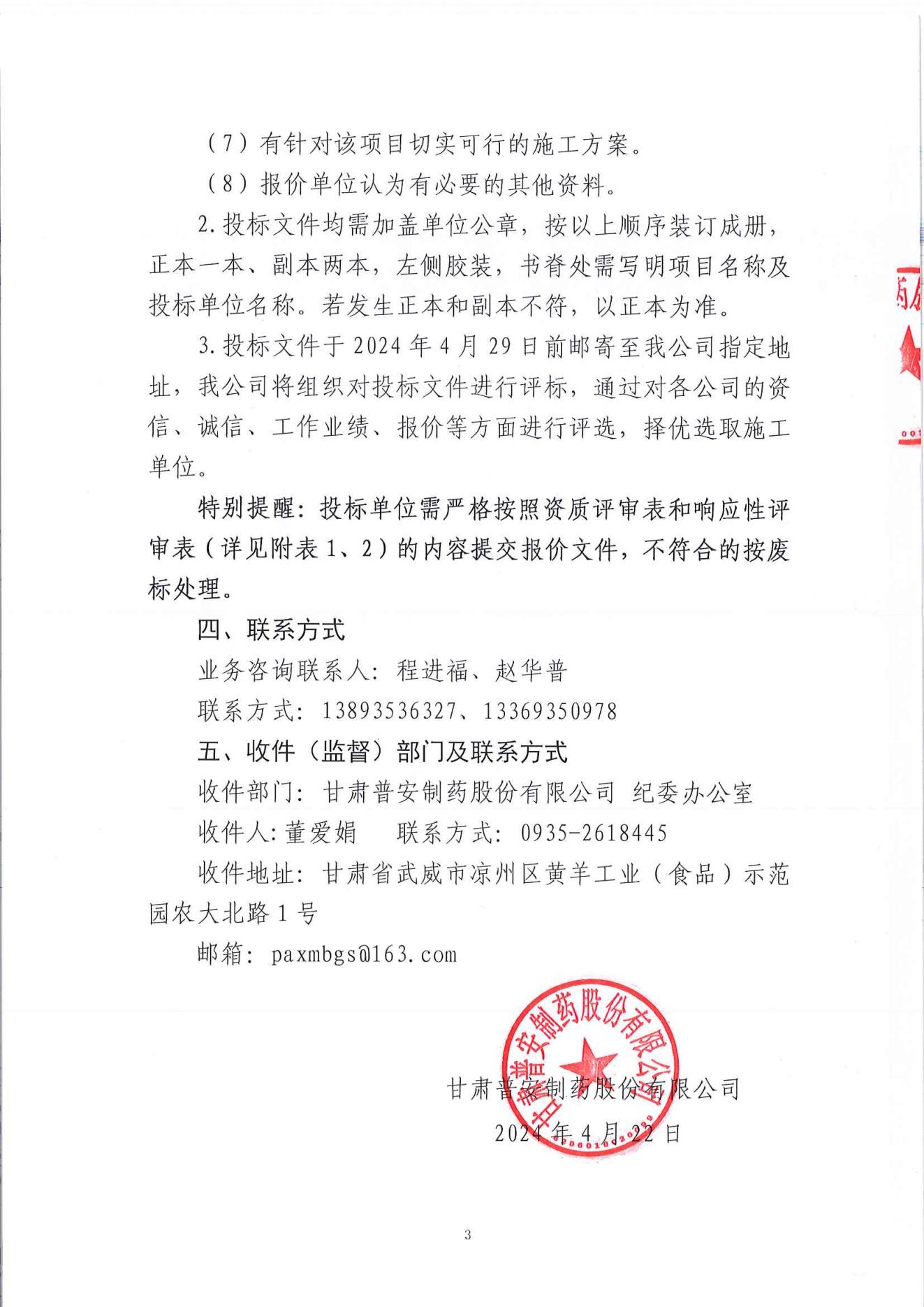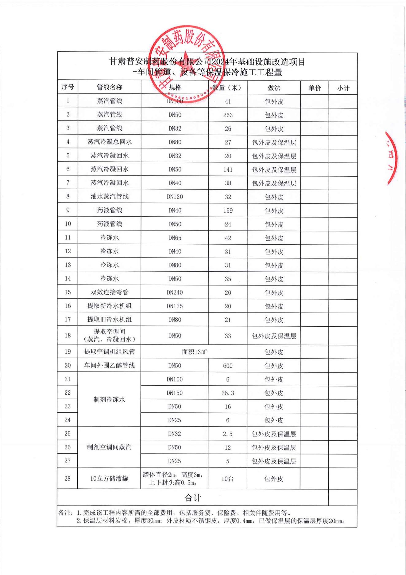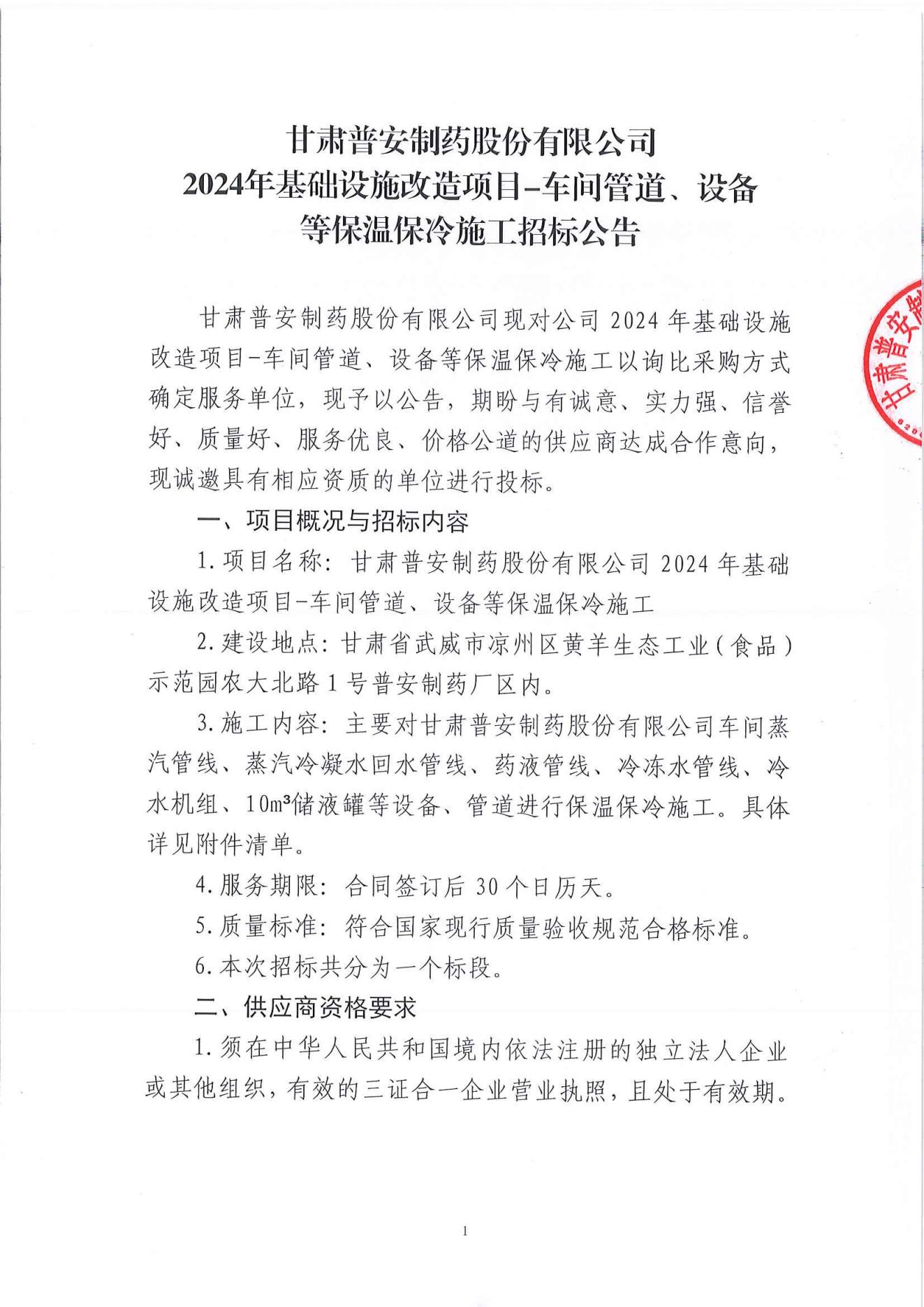 甘肅普安制藥股份有限公司2024年基礎(chǔ)設(shè)施改造項(xiàng)目-車(chē)間管道、設(shè)備等保溫保冷施工招標(biāo)公告