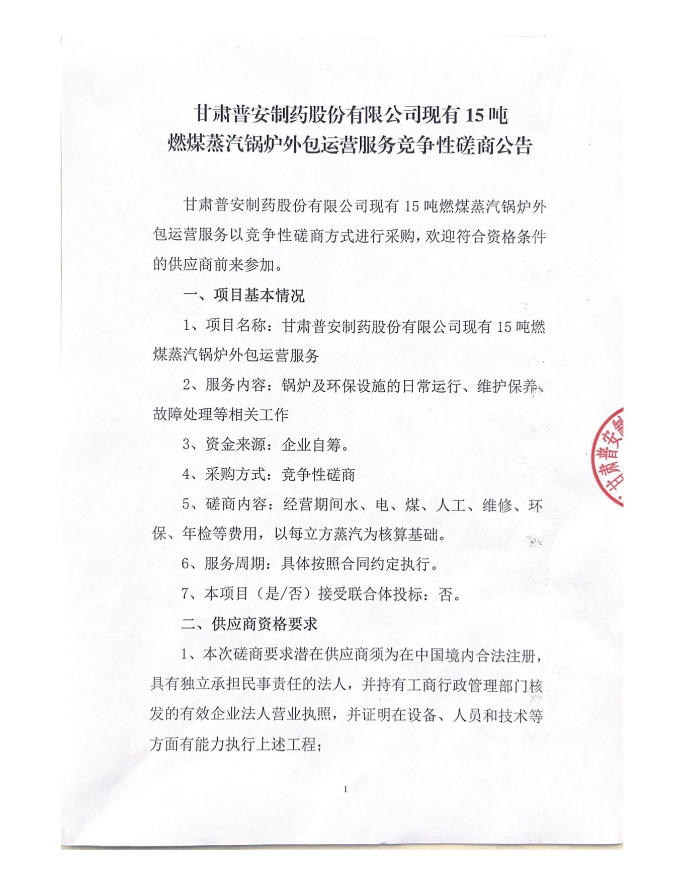甘肅普安制藥股份有限公司現(xiàn)有15噸燃煤蒸汽鍋爐外包運營服務(wù)競爭性磋商公告
