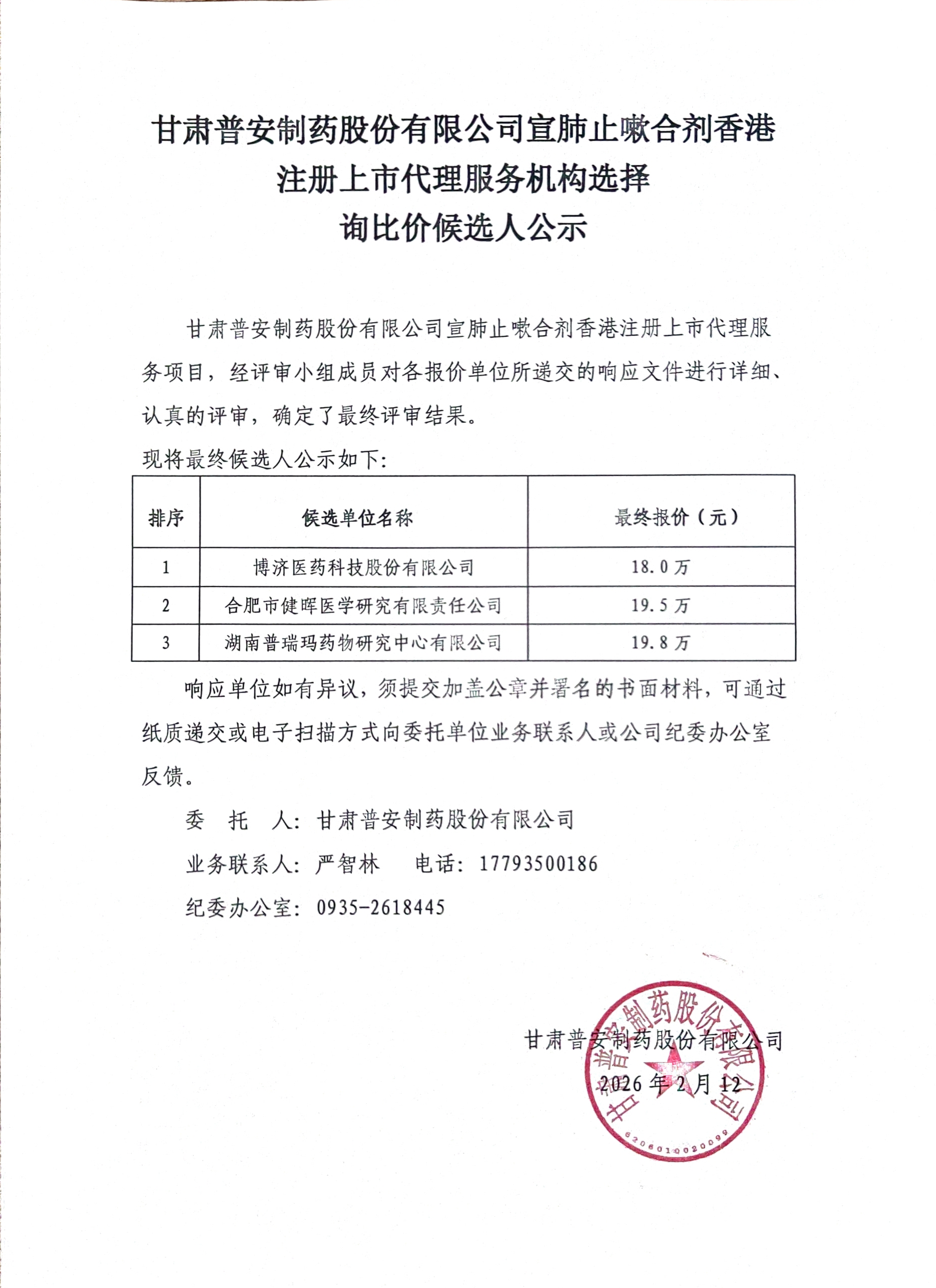 甘肅普安制藥股份有限公司宣肺止嗽合劑香港注冊上市代理服務機構選擇詢比價候選人公示