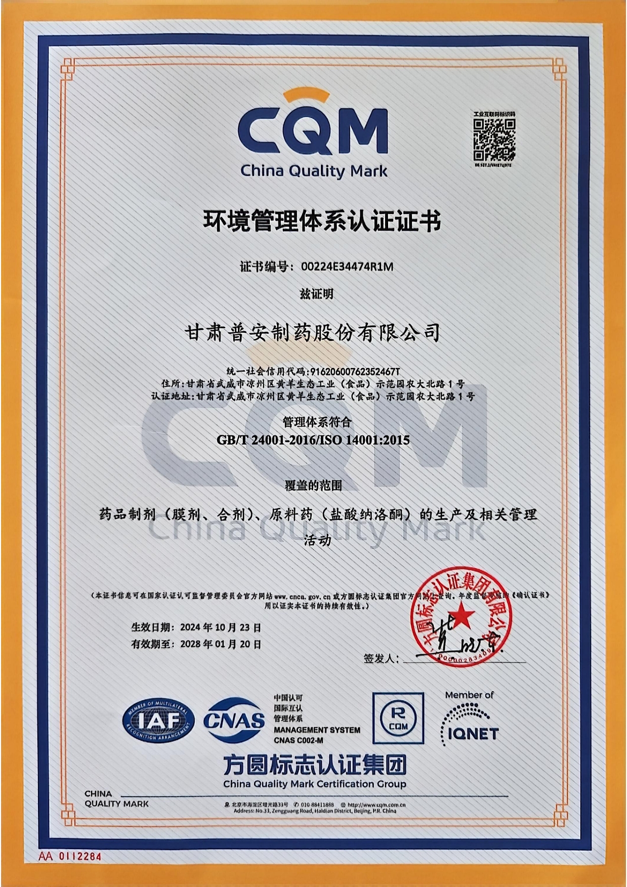 環(huán)境管理體系認證證書