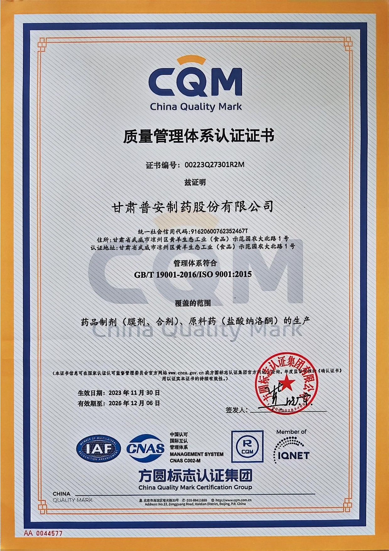 質(zhì)量管理體系認證證書